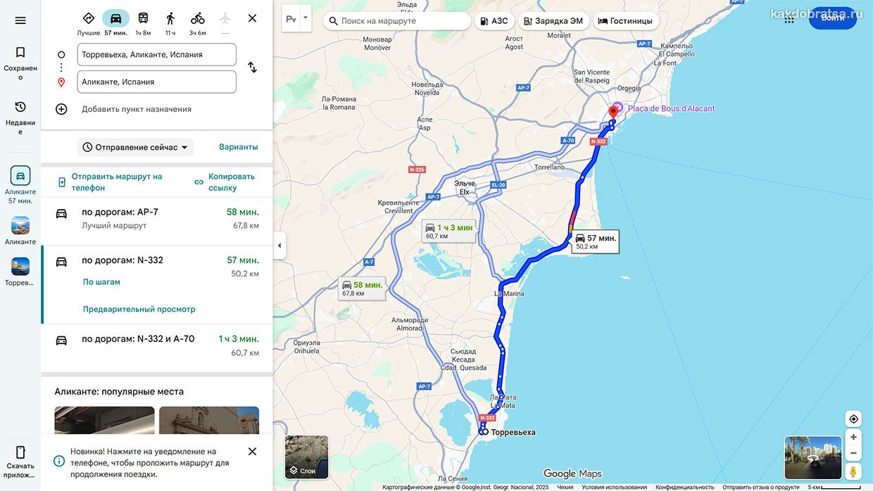 Расстояние по карте от Торревьехи до Аликанте составляет 50 км. Наиболее короткий путь между городами вдоль моря показан на карте ниже.